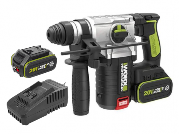 • פטישון נטען עוצמתי בעל מנוע ללא פחמים הפועל על סוללות 20V של חברת WORX מדור שני
